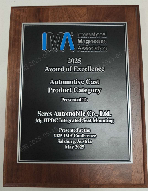 在奥地利举办的第82届世界镁业大会上,赛力斯集团的“镁合金一体化高压压铸座椅支架件”项目荣获国际镁协(IMA)2025年度“优秀汽车铸件奖”。这体现了赛力斯在材料科学和制造工艺上的持续创新突破,标志着赛力斯在镁合金汽车应用领域已跻身全球领跑者行列。