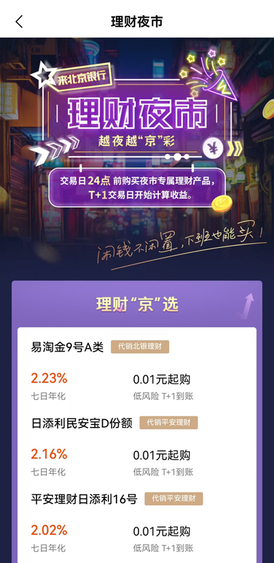 记者注意到,除了工银理财推出的“8点档”夜市外,光大银行、招商银行、平安银行、渤海银行、北京银行等多家银行均上线了“理财夜市”。部分银行、理财公司还推出了“24小时不打烊”模式的理财产品。“理财夜市”的产品范围不仅涉及现金理财产品,还包含了部分短债理财产品,业绩比较基准多在2%至3%之间,风险多为R1。