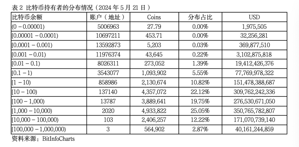 据相关网站统计,少数个人、企业和交易所持有了最多的比特币。就个人账户而言,至今保持神秘的“比特币之父”中本聪持有最多的比特币,Winklevoss Twins账户持有7万个比特币,全球最大加密货币交易所币安(Binance)创始人赵长鹏持有的比特币价值估计超过千亿美元。就公司账户而言,灰度投资组合持有643572个比特币,约占发行总量的3%,软件公司微策略(Microstrategy)持有129699个比特币,占总发行量的0.6%,特斯拉持有10725个比特币。