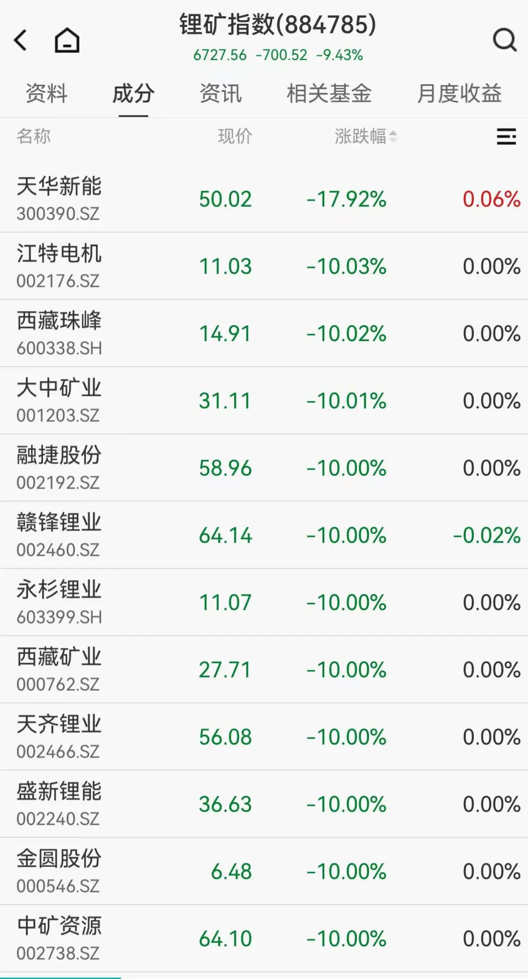锂电产业链全线%的跌幅,领跌A股。江特电机、西藏珠峰、赣锋锂业、西藏矿业等多股跌停,天华新能重挫近18%。