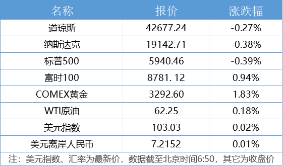 1、美国三大股指小幅收跌,道指跌0.27%报42677.24点,标普500指数跌0.39%报5940.46点,终结六连涨,纳指跌0.38%报19142.71点。中概股多数下跌,中通快递跌超8%,唯品会跌逾7%。