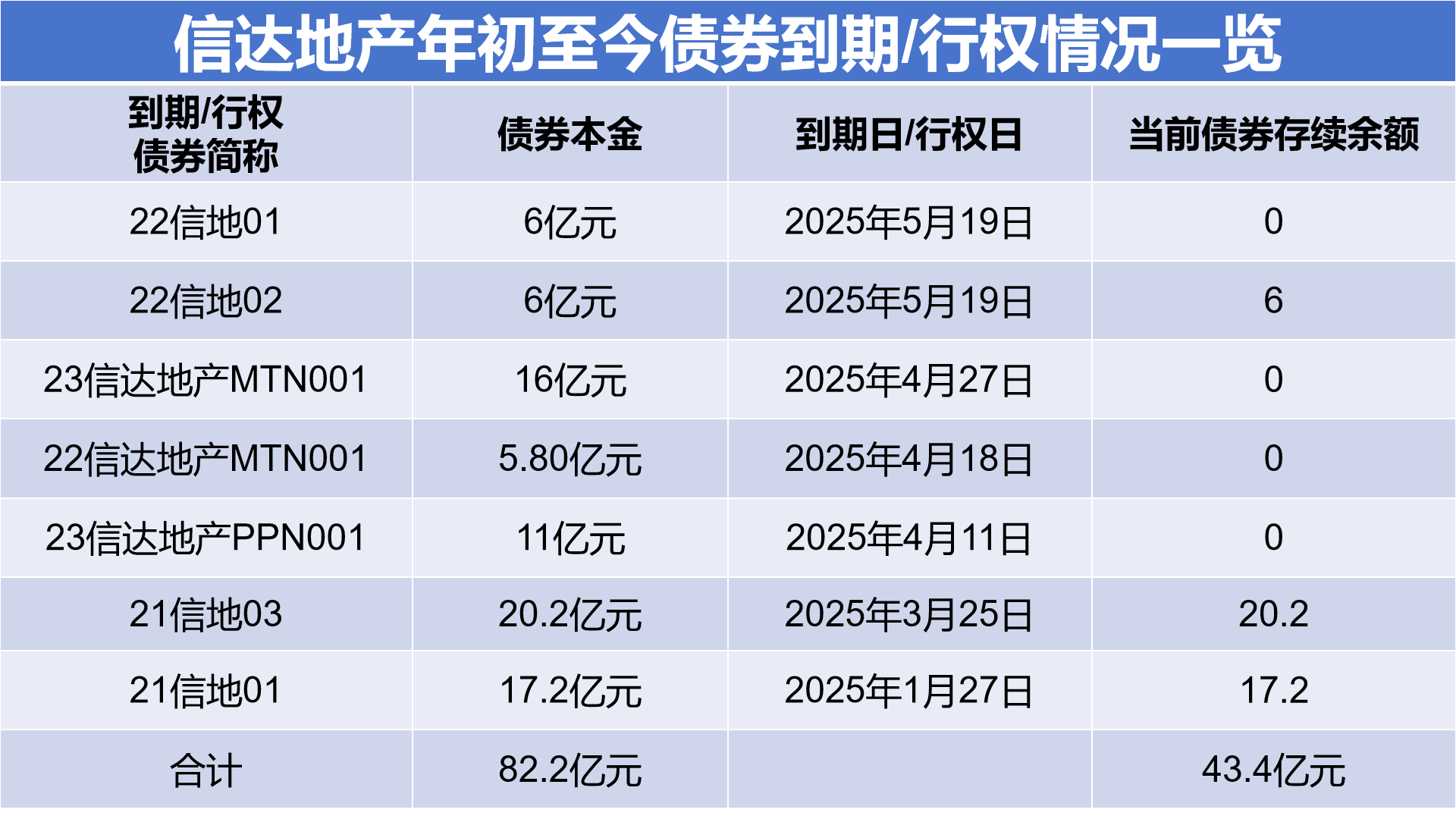 据时代周报记者统计,2025年初至5月23日,信达地产已有7笔债券到期或行权,债券本金合计82.2亿元。其中,“23信达地产PPN001”、“22信达地产MTN001”、“23信达地产MTN001”、“22信地01”4笔债券完成偿付,偿付债券本金38.8亿元。
