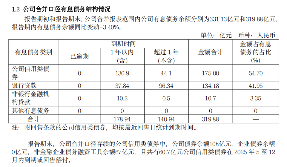 年报数据显示,截至2024年末,信达地产合计有息负债319.88亿元,包含公司信用类债券175亿元、银行贷款134.18亿元、非银行金融机构贷款10.7亿元。其中,一年内到期有息负债178.94亿元,一年内到期或行权信用类债券金额高达130.9亿元。