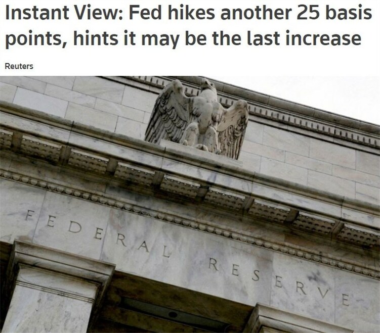 这是美联储自2022年3月以来的第十次加息,累计加息幅度达500个基点。