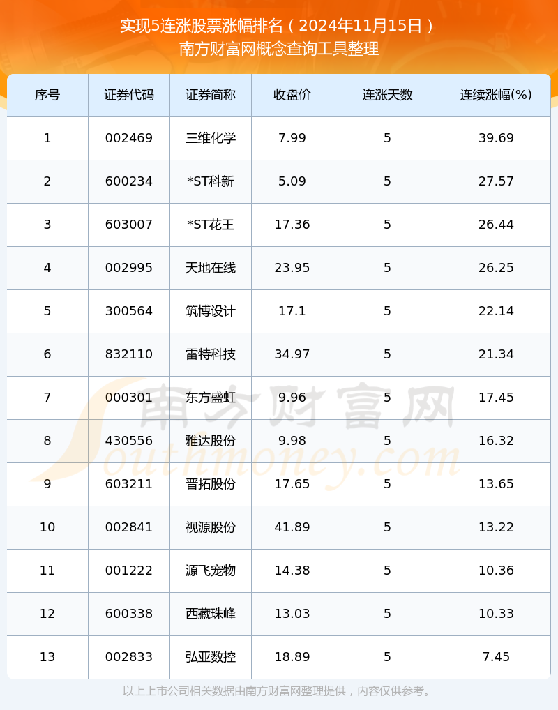 根据南方财富网概念查询工具数据统计,截止2024年11月15日收盘,共有13只个股实现5天连涨。其中连续涨幅较大的个股有三维化学、*ST科新、*ST花王等,连续涨幅分别为39.69%、27.57%、26.44%。