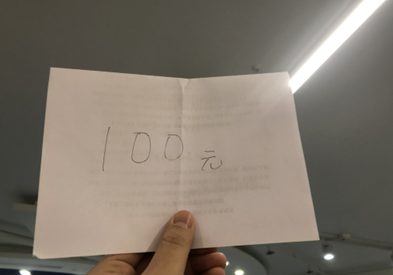 笔者在东经116,北纬40,北京市某条街、某个写字楼、这个时间、这个湿度、温度、落笔力度、书法进阶程度在这张被主编毙掉的废稿子背面写下的“100元”。