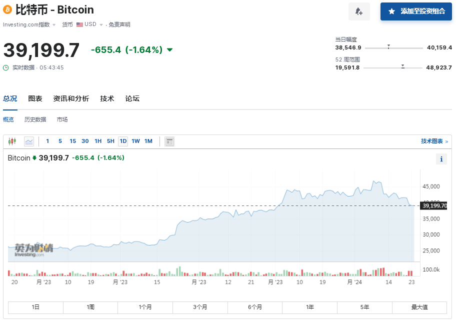 自现货比特币ETF获批上市以来,虚拟货币市场便一直处于下跌趋势之中。比特币价格从1月11日的最高点48969美元下跌至1月23日的39000美元以下,下跌幅度超20%。