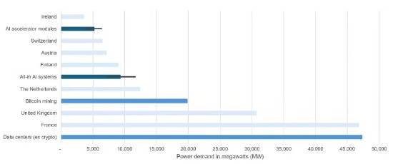 该学者预测到2025年年底,AI电力需求可能达到23GW,接近全球数据中心用电量的一半,相当于英国全国的用电量。相比之下,比特币挖矿的能耗曾是研究重点,但随着以太坊等加密货币转向低能耗技术,AI成为新的能源消耗“黑洞”。