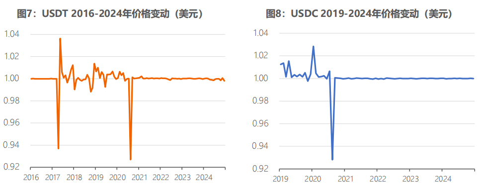 两大稳定币在2021年前经历过多次价格波动:2017年开始,USDT的发行公司Tether因关联公司Bitfinex交易所的银行纠纷引发美元储备质疑,频遭法律调查;2020年,受新冠疫情影响,加密货币市场恐慌性抛售导致两币出现脱锚;2021年后,随着发行方加强储备透明度,以及市场机制的完善,价格基本稳定在1美元水平。