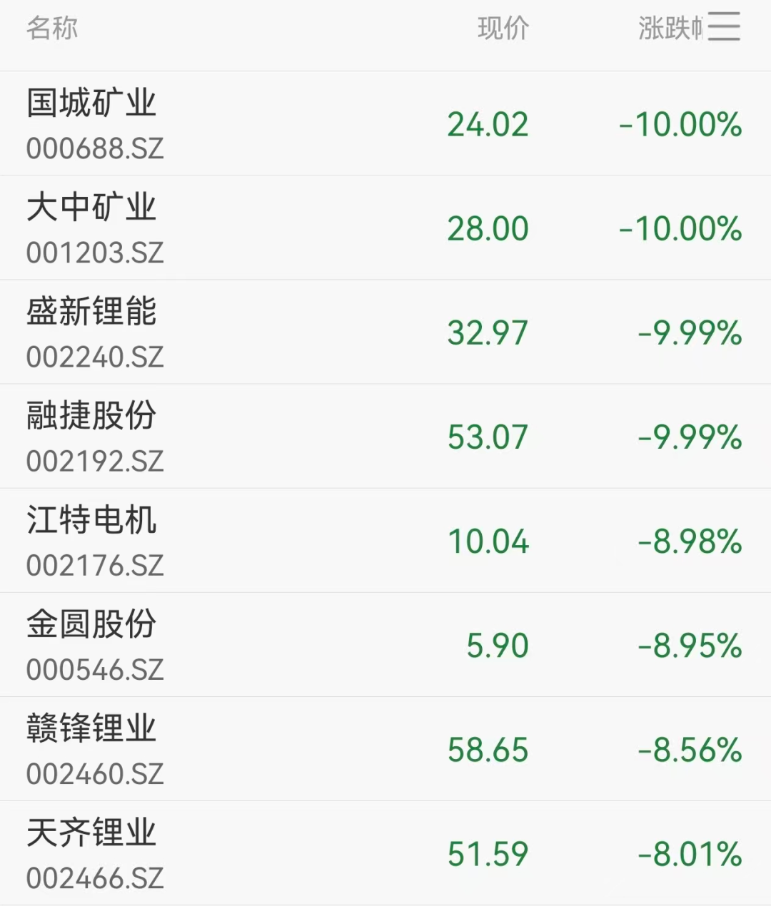 下跌方面,锂矿板块再现跌停潮,盐湖提锂、磷化工、电池回收等概念股集体走低。国城矿业、大中矿业、盛新锂能、融捷股份跌停,江特电机、金圆股份等多股跌超8%。