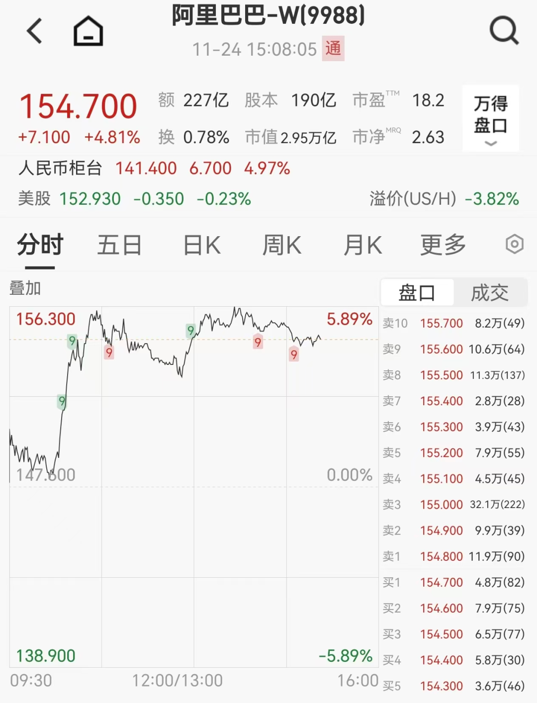截至24日15:08左右,香港恒生科技指数上涨约2.7%,快手、哔哩哔哩涨超6%,阿里巴巴港股股价直线万亿港元。