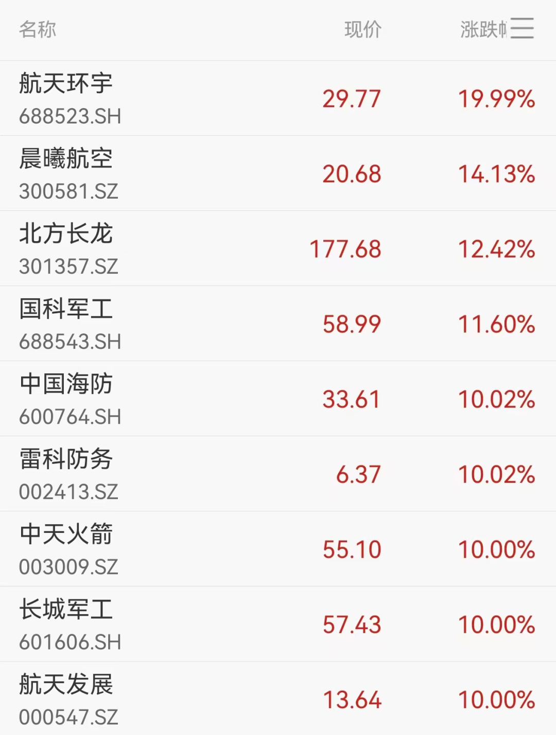 从板块来看,军工板块爆发,中船防务4天2板,江龙船艇再次20cm涨停,已6天3板。商业航天概念持续拉升,中天火箭、航天发展等10股涨停。