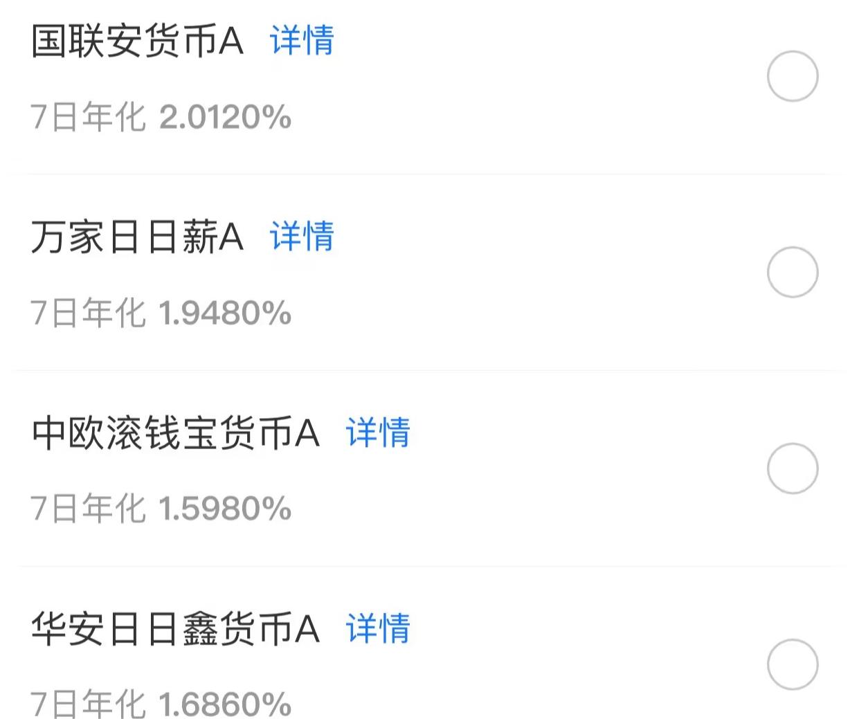 2、买货币基金。货币基金是一种投资于货币市场工具的基金,主要投资对象包括短期国债、央行票据、银行存款、同业存单等。货币基金的优点是资金流动性好、风险低、收益稳定。货币基金的年化收益率一般在1%~3%之间,且多为开放式基金,申购赎回方便,例如余额宝内就提供了多只货币基金供投资者们选择: